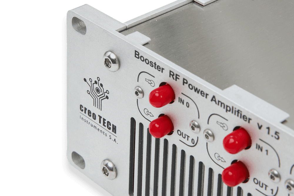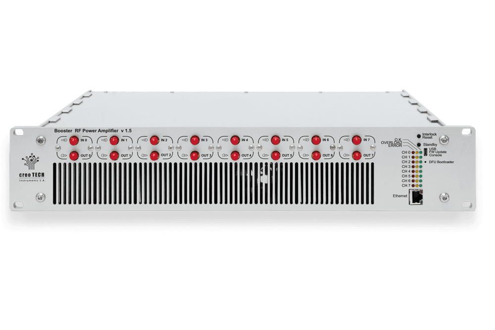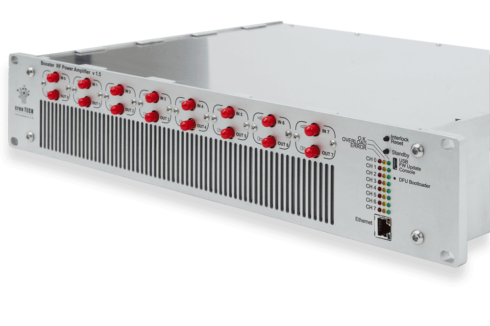 Booster HL is an 8-channel RF power amplifier delivering several watts across 100–500 MHz, housed in a compact 19” 2U chassis. It features very low signal distortion (THD), remote monitoring, and configurable interlocks via an Ethernet interface. The modular design allows field-replaceable channels, making Booster HL ideal for advanced RF applications requiring high linearity and precise control.
